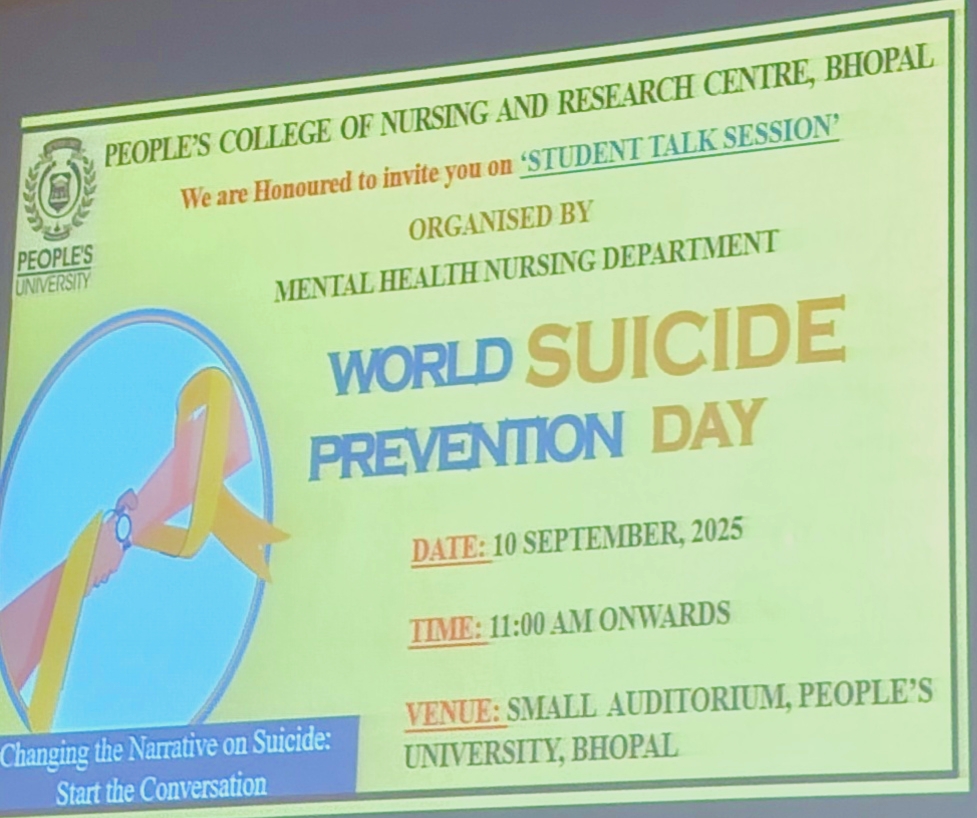 On the occasion of World Suicide Prevention Day, observed on 10th September 2025, a Student Talk Session was organized by the Department of Mental Health Nursing, People's University, Bhopal (M.P.), based on the theme: "Changing the Narrative on Suicide - Start the Conversation."